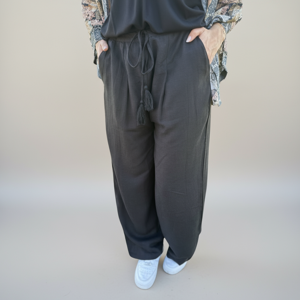– avslappnade, svarta byxor som kombinerar komfort med stil. Perfekta för vardagen, hemmakontoret eller lediga helger när du vill känna dig både bekväm och trendig.