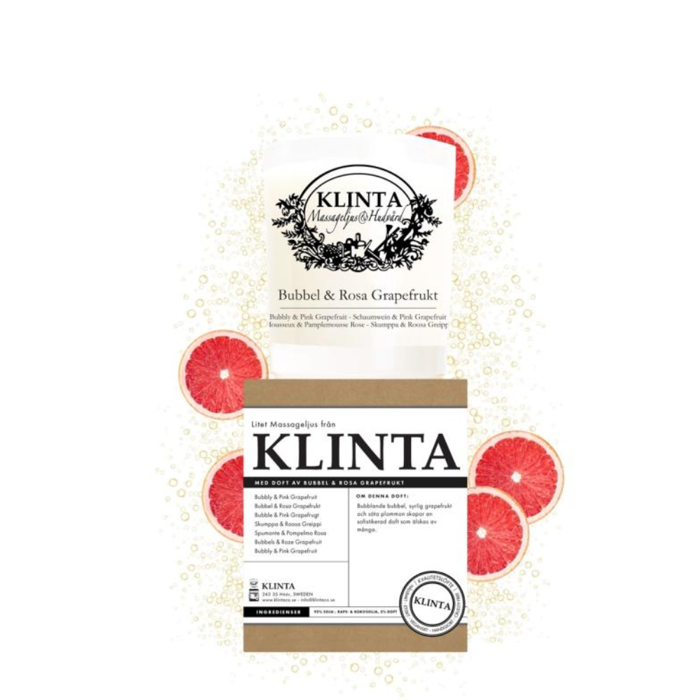 Märke: KLINTA Produkt: Doftljus Produktnamn: Doftljus & Massageljus Bubbel & Rosa Grapefrukt Färg: Klarglas Doft: Bubbel & Rosa Grapefrukt Brinntid: 18t 45h |