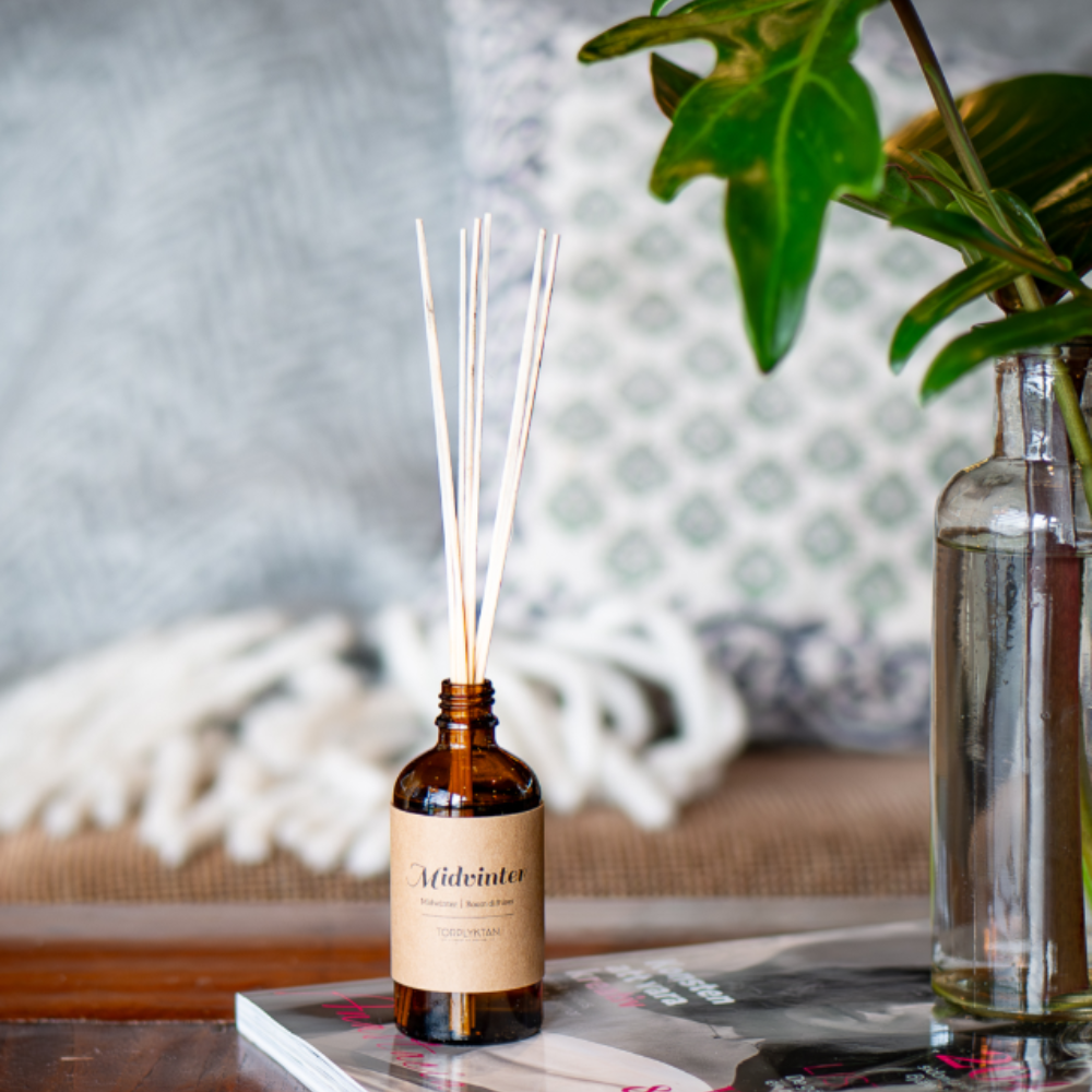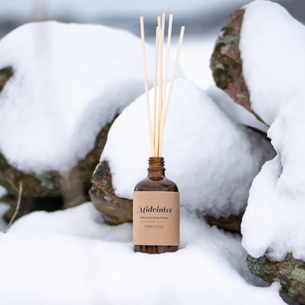 Torplyktans doftpinnar Midvinter sprider en mjuk och värmande doft av sandelträ och cederträ, med en subtil ton av rostad vanilj.