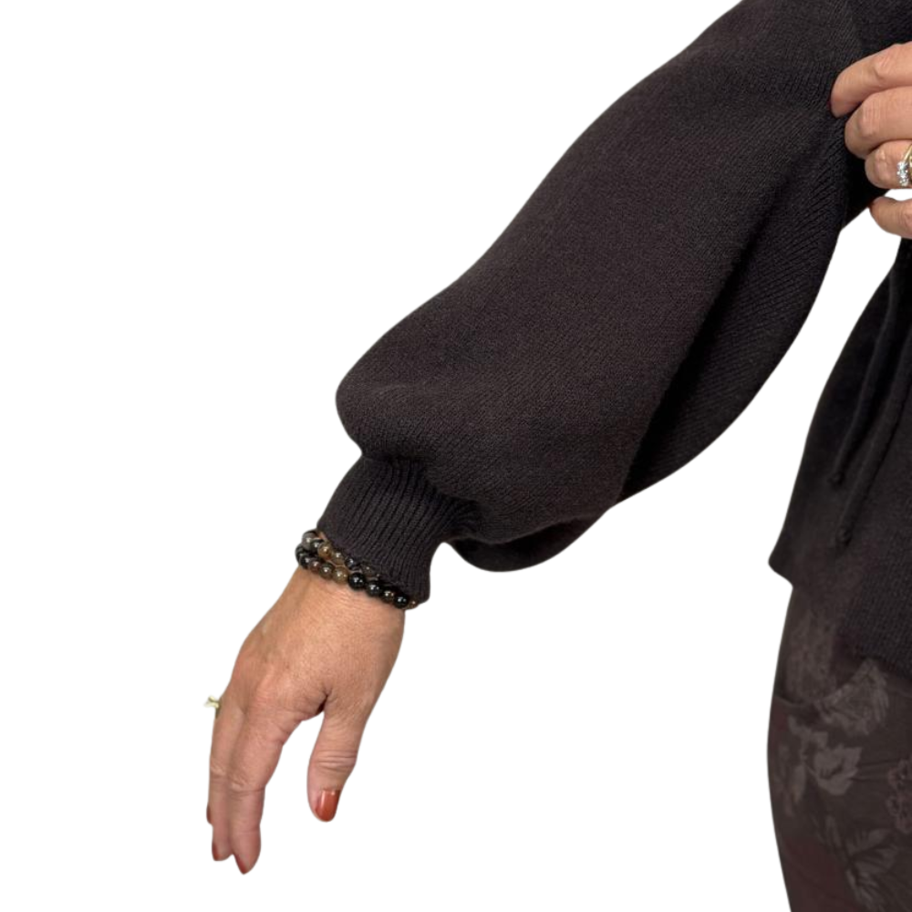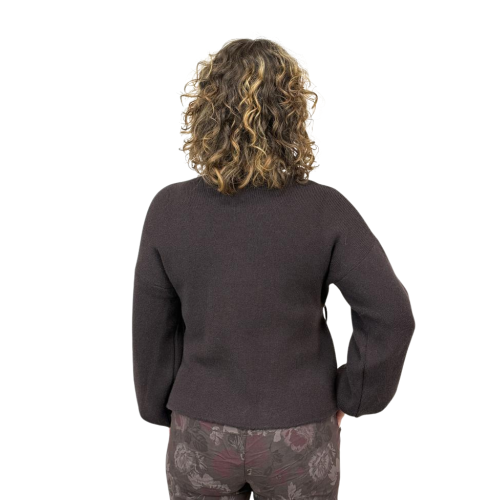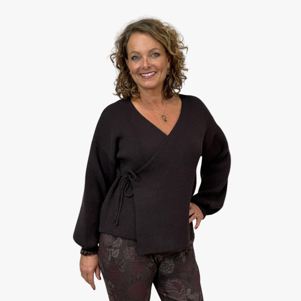 Den puffiga ärmen med mudd nertill skapar en modern siluett, medan omlottmodellen framhäver figuren på ett elegant sätt. En feminin och tidlös kofta som passar lika bra till vardagsjeansen som över en klänning till fest.