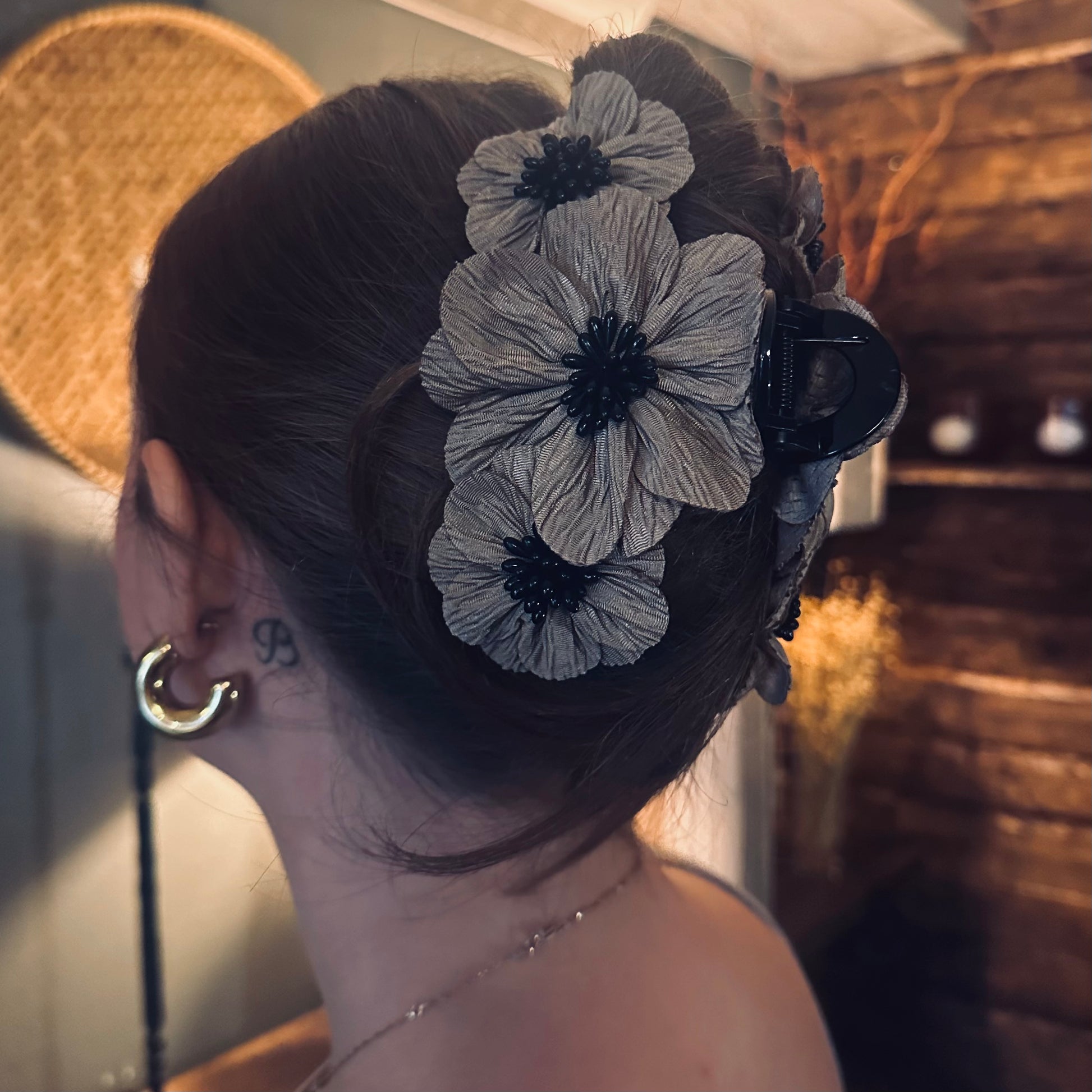 Denna söta hårklämma är prydd med vackra blommor och ger en lekfull och feminin touch till din frisyr. Perfekt för både vardag och fest, och lyfter enkelt en enkel uppsättning eller ger en extra detalj till din styling.