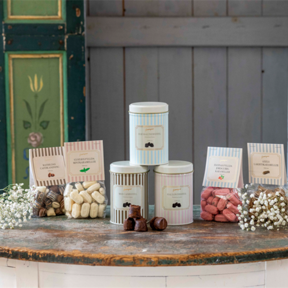 Fyllda jordgubbskarameller – hårda karameller med en söt och fruktig smak av solmogna jordgubbar.