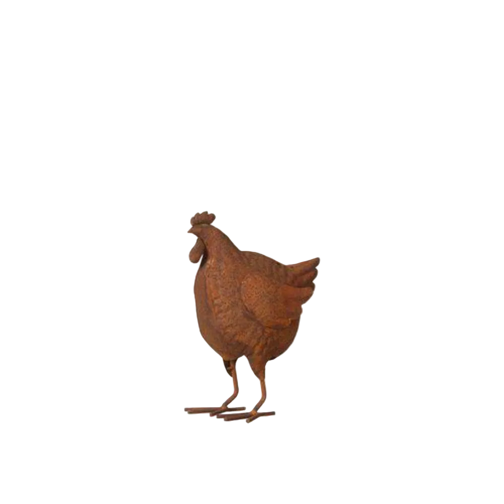 Denna fina höna i rostig plåt är en dekorativ detalj med charmig, lantlig känsla. Den vackert patinerade ytan i nyanser av brunt, orange och djuprött ger hönan ett rustikt och vintageinspirerat uttryck som skapar en varm och levande atmosfär.