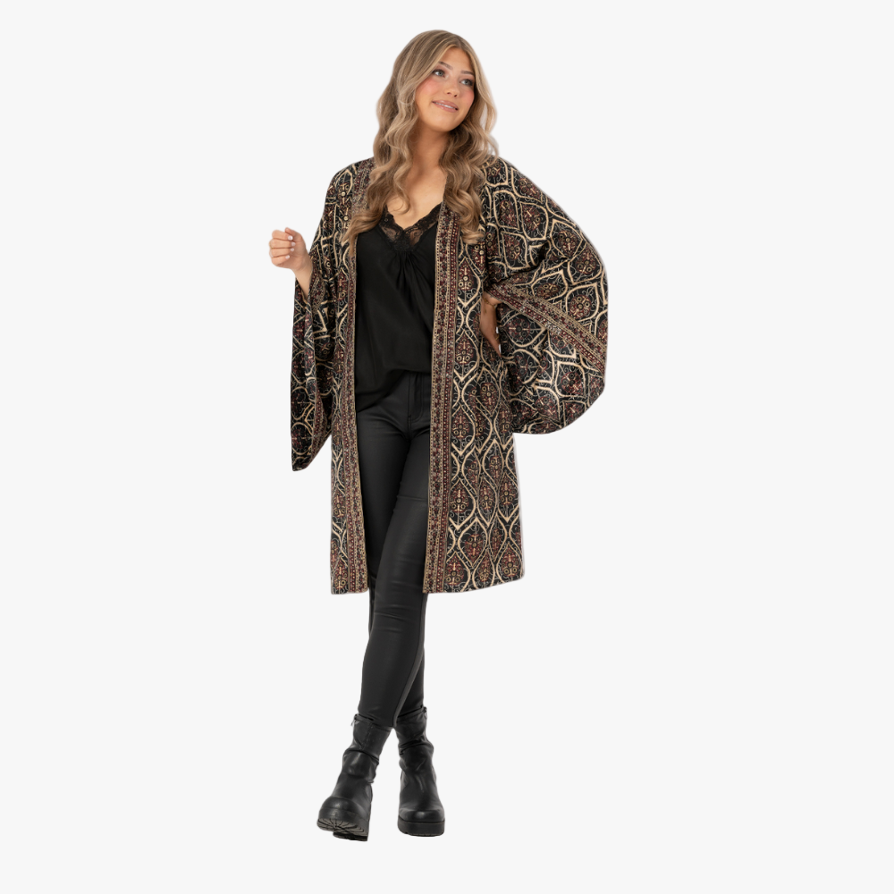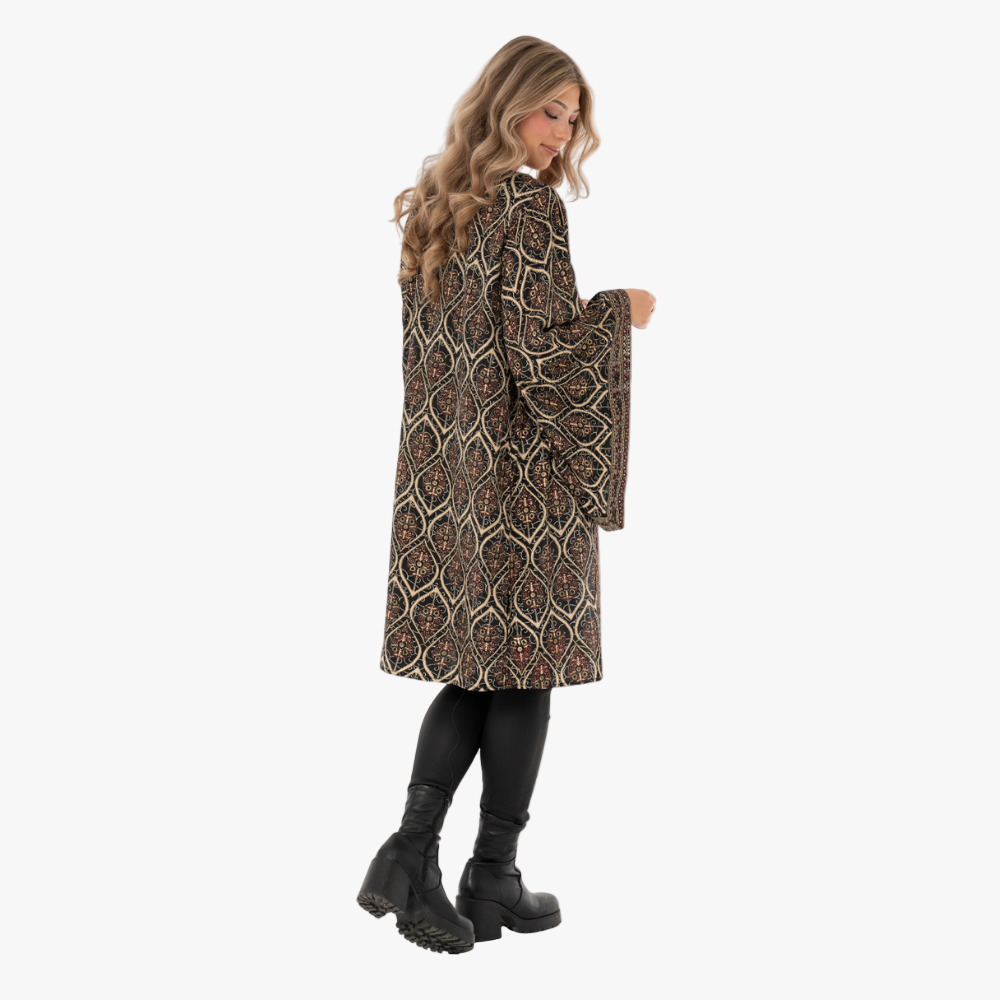 Spana in godbiten Leiya Kaftan i vackra höstfärger med inslag av lyxigt guld. Hela kaftanen är gjord i ett underbart medaljonginspirerat mönster med en bred bård längst med öppningen fram. Samma bård finns även i ärmavslutet.