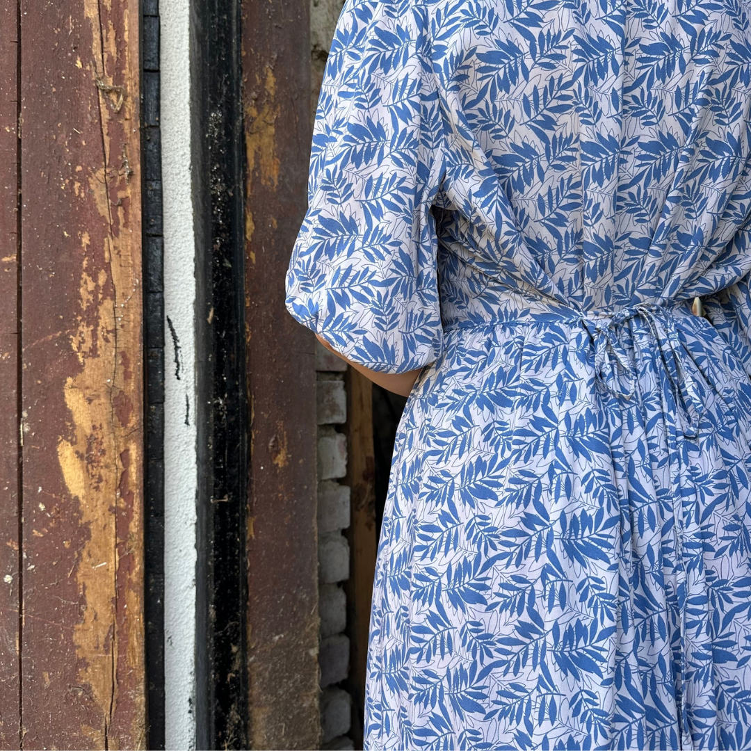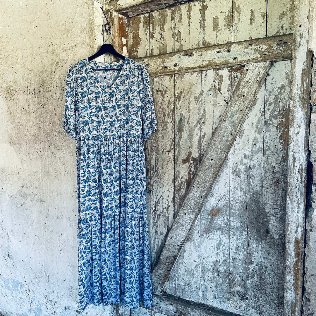 Produktnamn: Klänning Blå blad Färg: Blå / Beige Storlek: Onesize S-XL Tvättråd: 30 grader |
