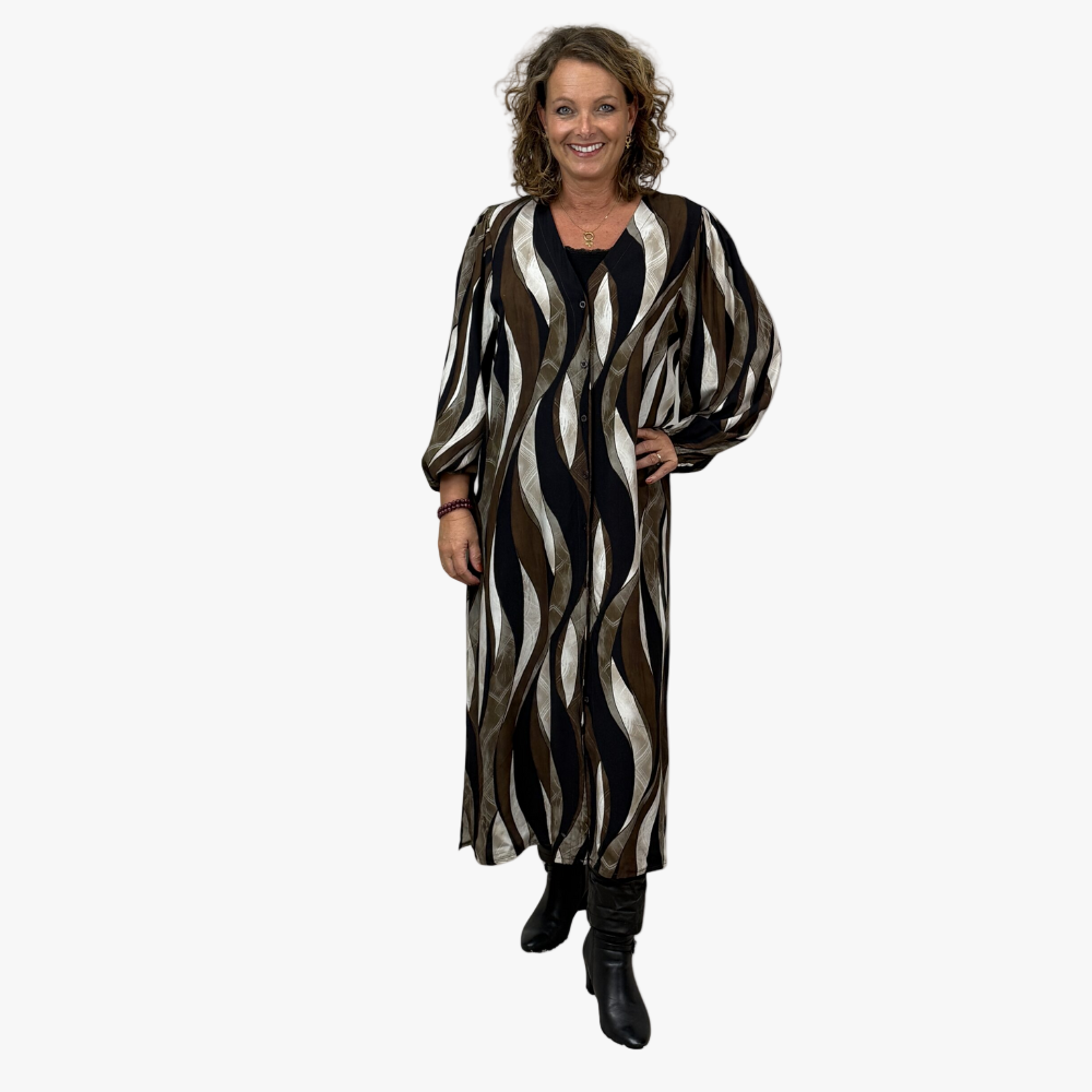 Klänning Petronella är en vacker mönstrad klänning som kombinerar klassisk elegans med modern design. Den har puffärmar som ger en feminin siluett och helknäppning framtill, vilket gör den både stilfull och lätt att bära.