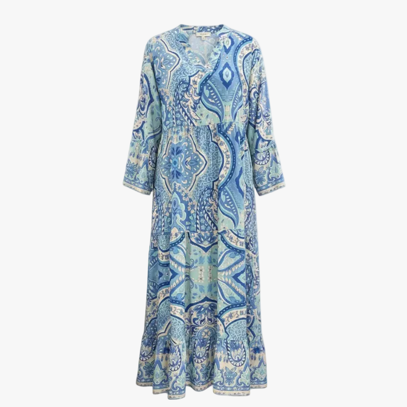 Klänning Zaara är en elegant och lättburen klänning i ett vackert blått mönster – perfekt inför säsongens alla härliga bjudningar. Den feminina trumpetärmen ger klänningen ett stilfullt uttryck och skapar ett vackert fall i rörelse.