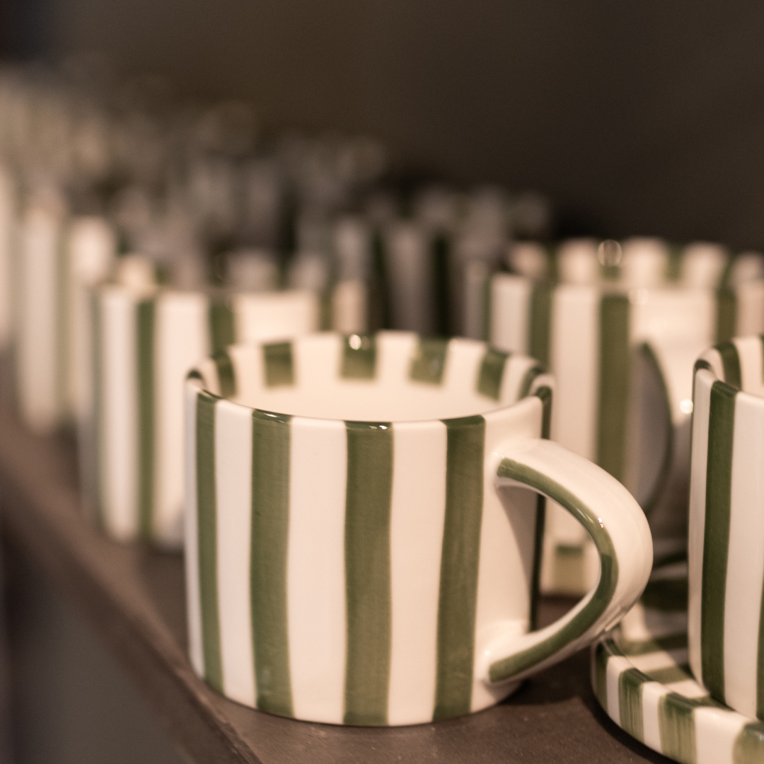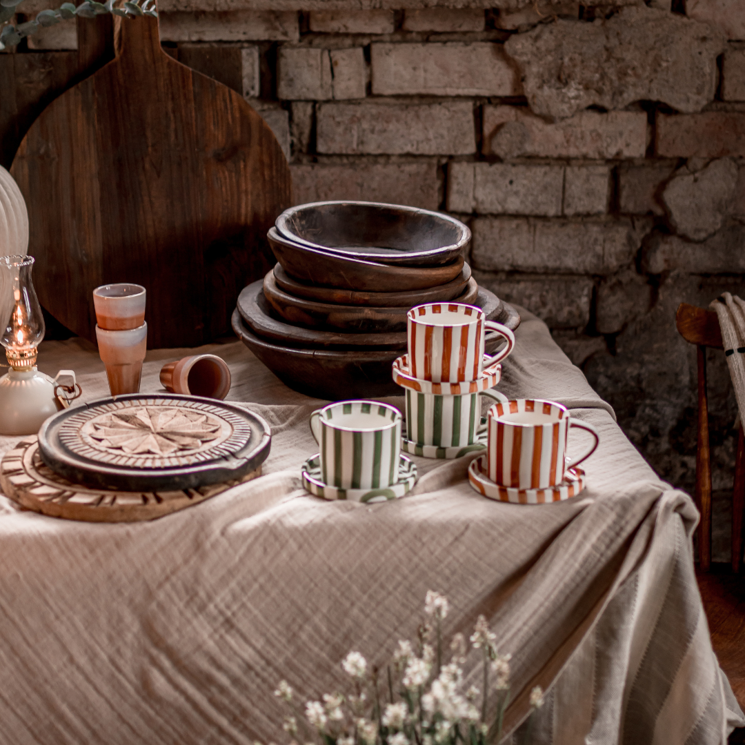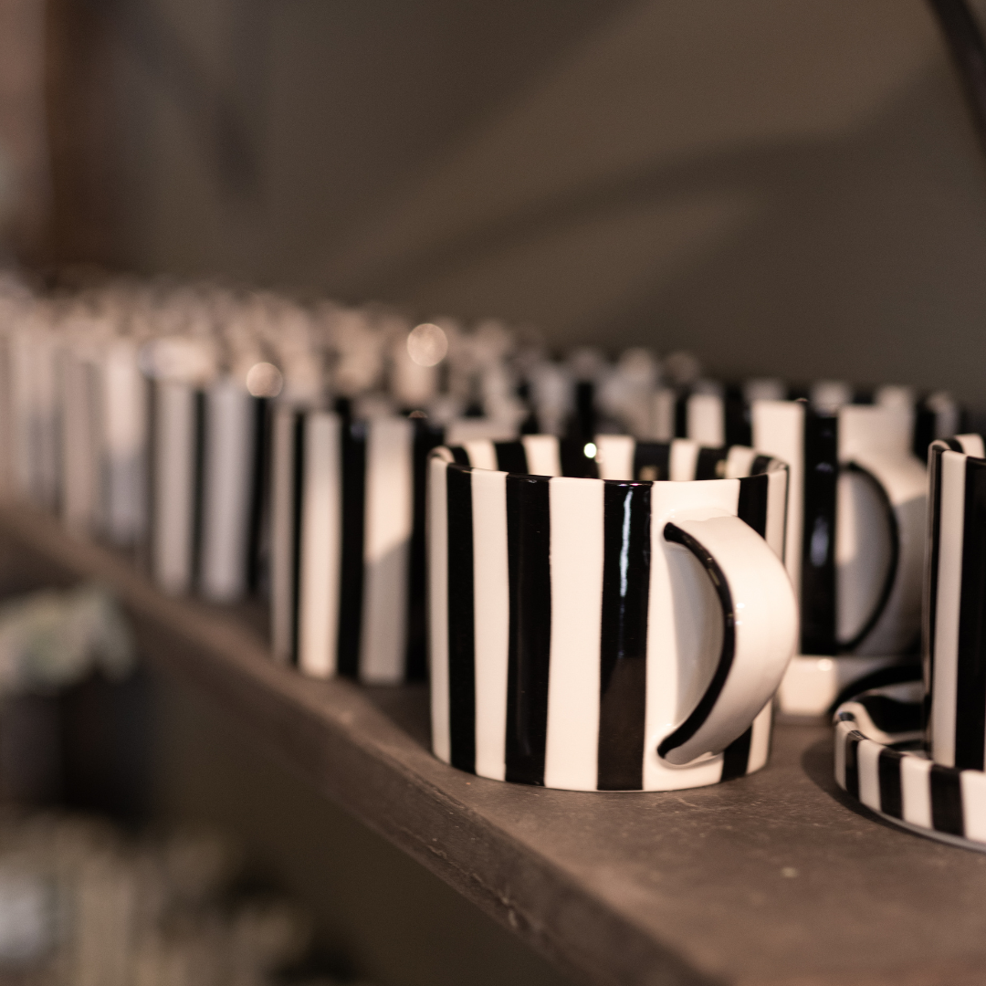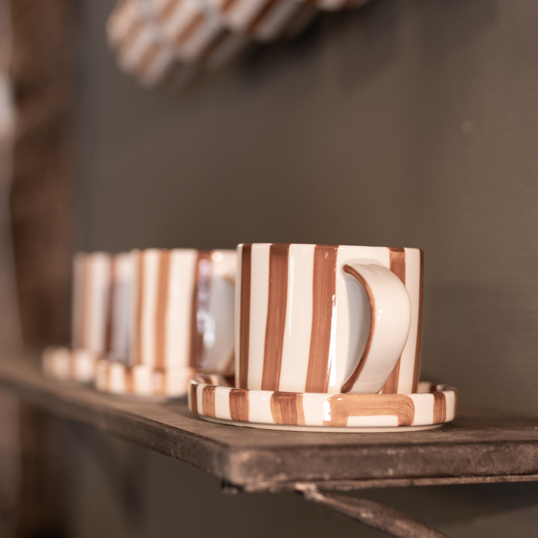 En vacker kopp i porslin med tillhörande fat och assiett, alla tre delar prydda med ett handmålat randigt mönster.