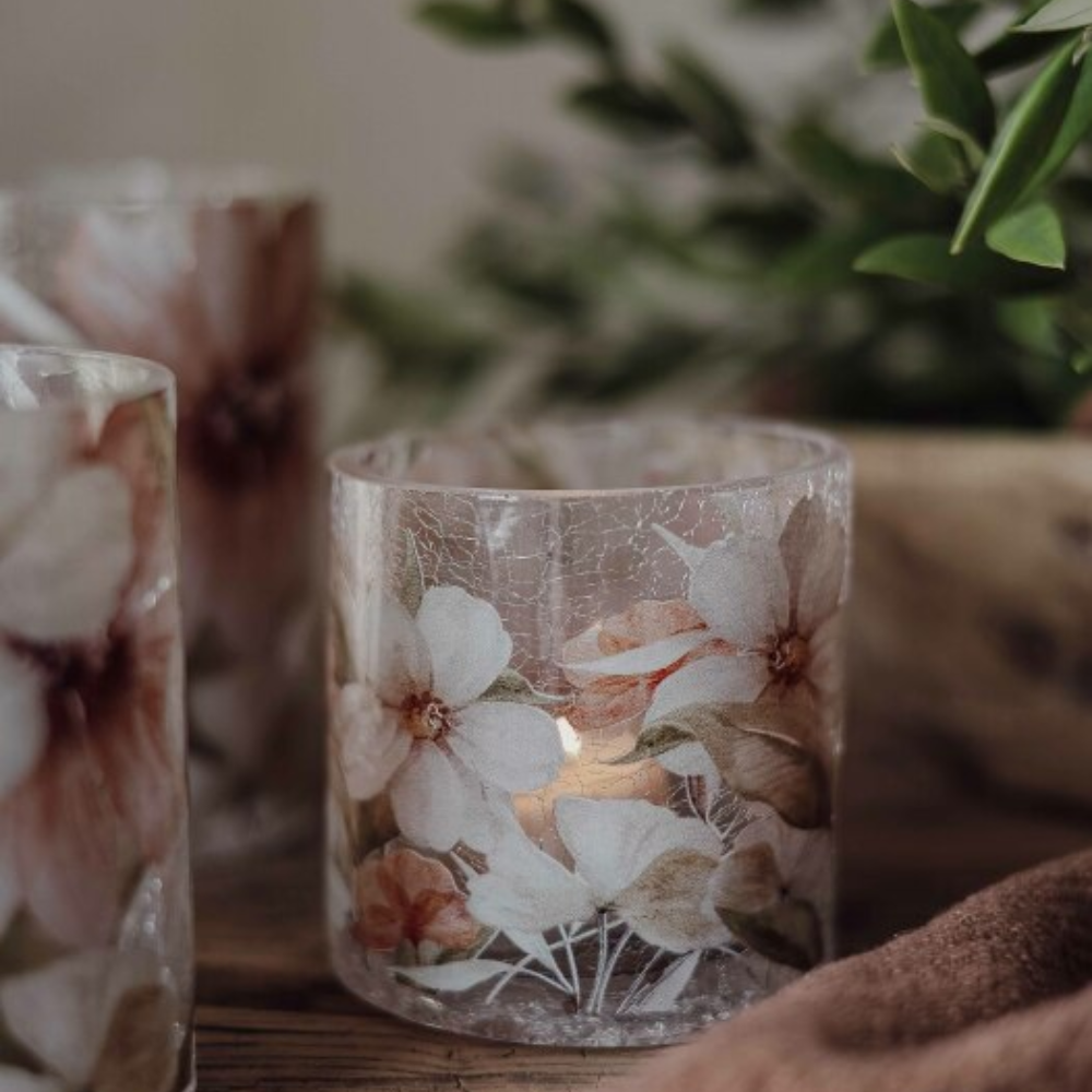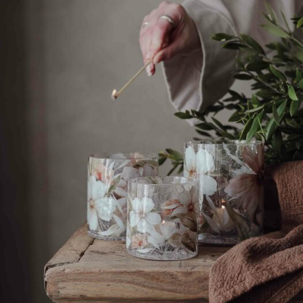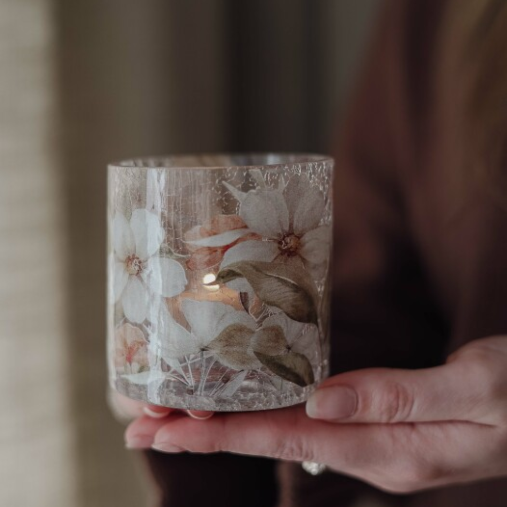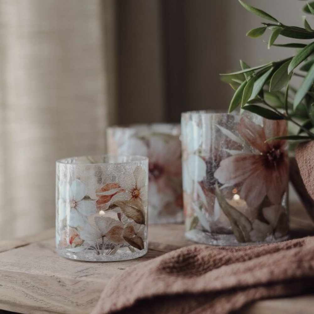 Majas lykta Fleur Finish är en handgjord glaslykta i krackelerat glas med vackra blommor och blad i naturens mjuka toner.