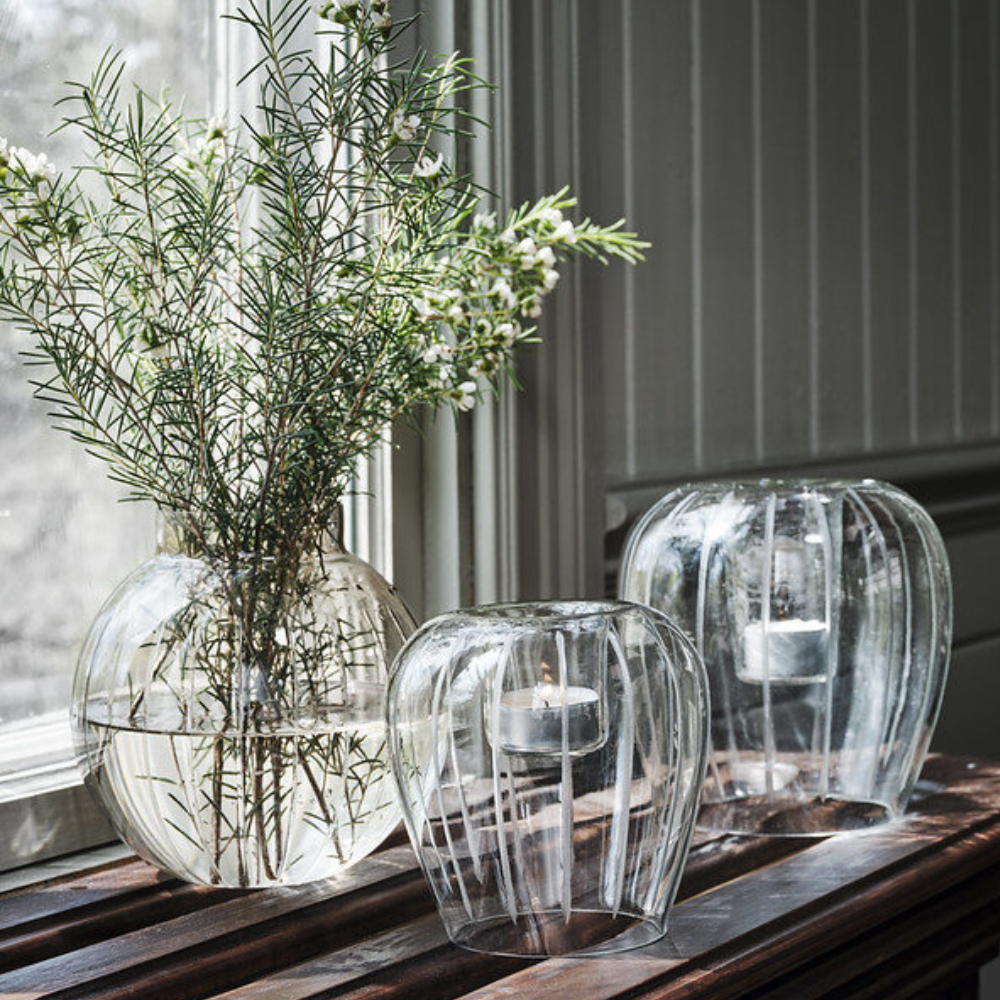 En stor, rundad ljuslykta i klarglas med vackert etsade ränder som fångar och reflekterar ljuset på ett stämningsfullt sätt. Värmeljuset placeras i den nedsänkta koppen och sprider därefter ett mjukt, behagligt sken i rummet.