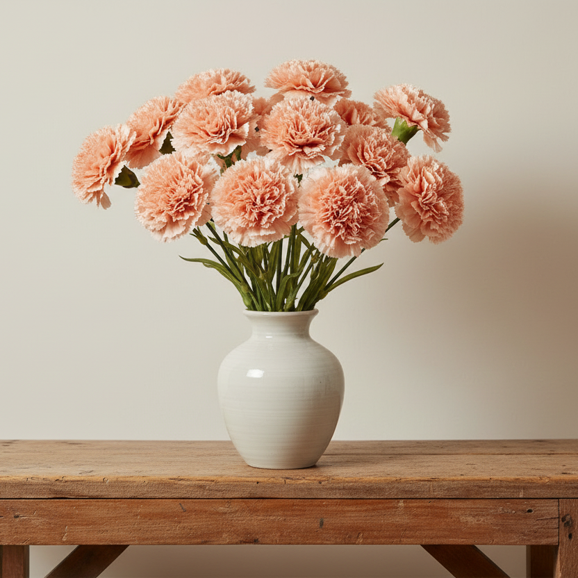 Den persiko-färgade nejlikan är lätt att kombinera med andra konstgjorda blommor och växter, och passar både i moderna och klassiska inredningsmiljöer.