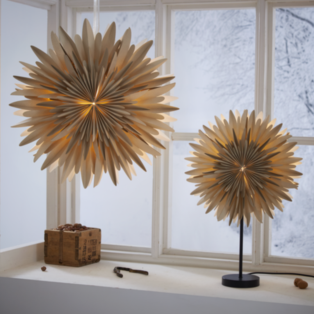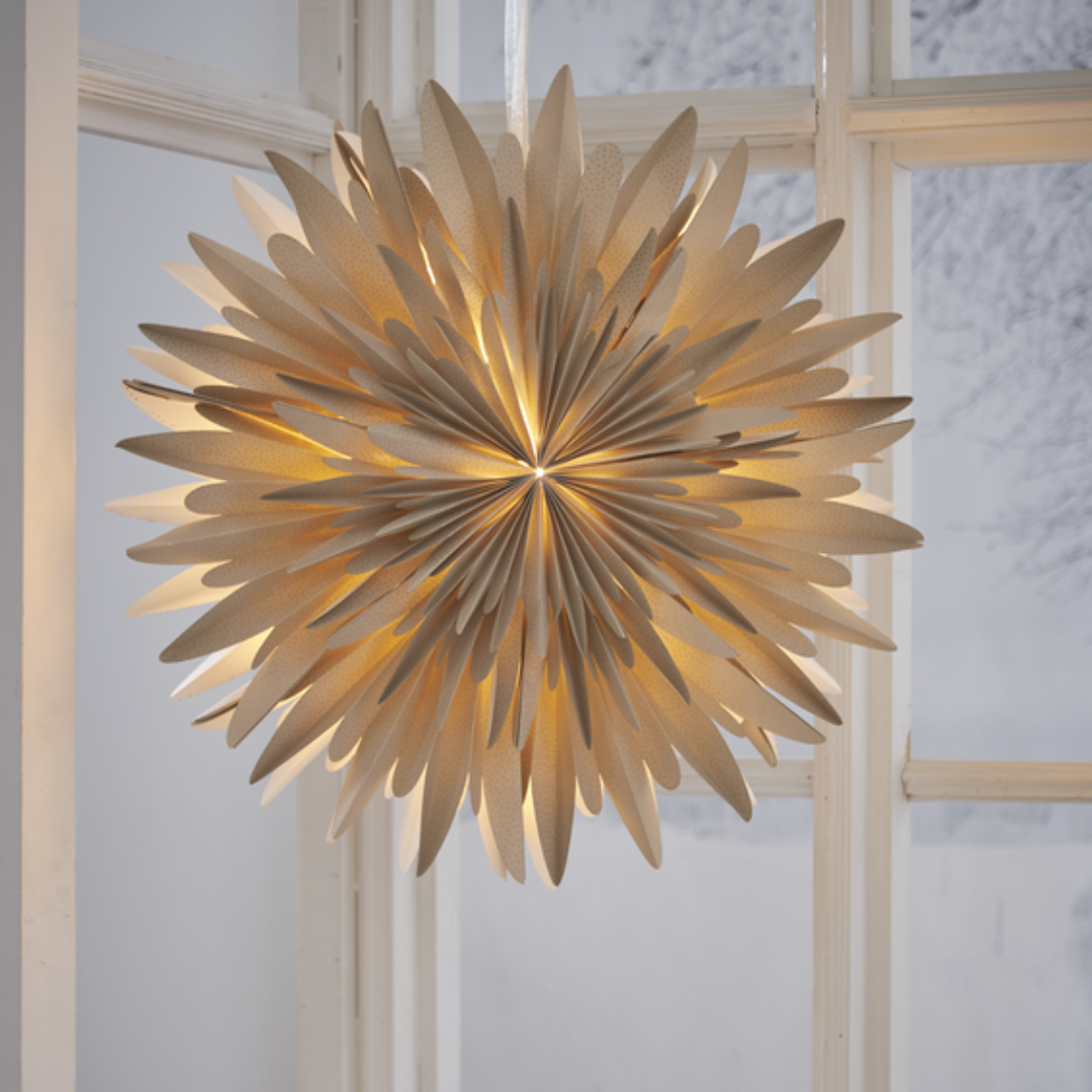 Produktnamn: Pappersstjärna Winter Färg: Beige Antal i frp: 1 Material: Papper Storlek: 60X60X19cm |
