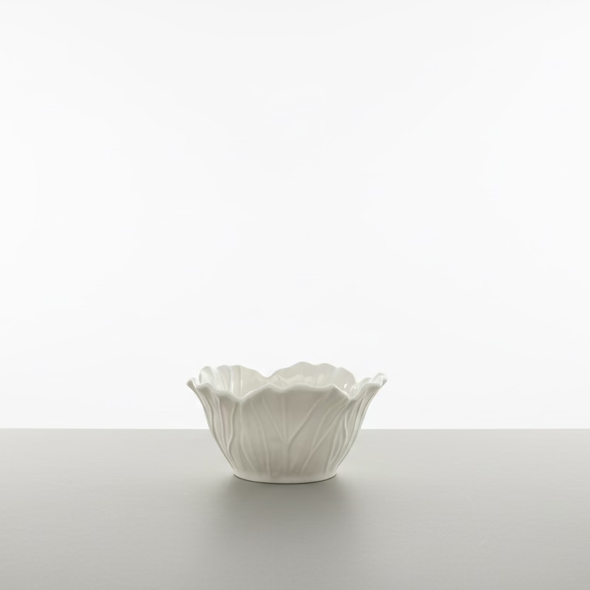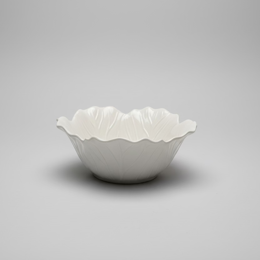 Porslinsserien Blad har en stilren och naturnära design där bladets form och elegans står i fokus. Serien är helt vit, vilket ger ett tidlöst och fräscht intryck, samtidigt som det diskreta mönstret – inspirerat av bladens naturliga ådring och form – ger en subtil men sofistikerad textur på ytan.