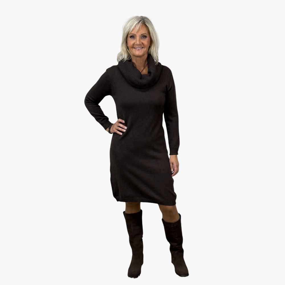 Nyckelord: stickad klänning, klänning med polokrage, klänning mix utantill, höstklänning dam, stickad poloklänning, elegant stickad klänning, lulu klänning