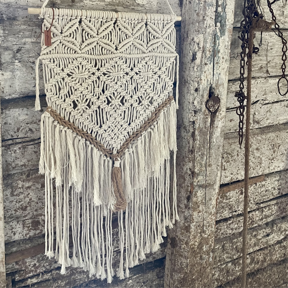 Skapa en varm och ombonad känsla i ditt hem med denna handgjorda makraméväggbonad från Frera. Den kraftiga designen med vackra mönster och subtil beige inflätning ger textur och karaktär, vilket gör den till en elegant och dekorativ detalj i rummet.