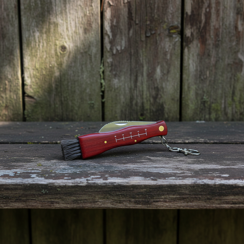Praktisk svampkniv från Korgboet med inbyggd borste – ett måste på höstens svamppromenader. Den smarta 2-i-1-designen gör det enkelt att både skära av svampen och borsta bort jord direkt i skogen.