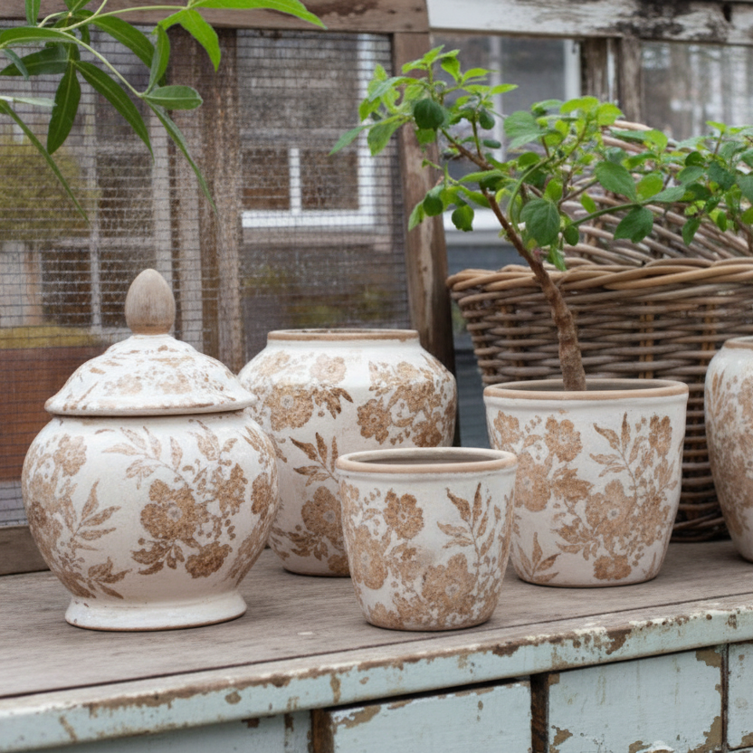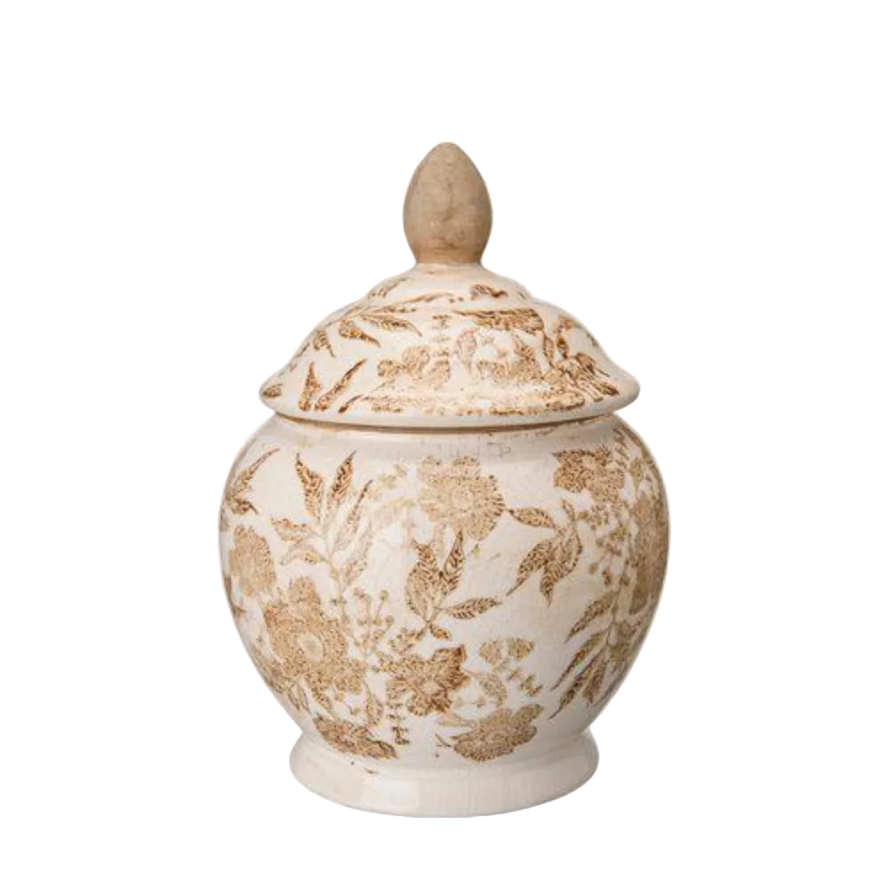 Beda urna med lock är en stilfull och funktionell inredningsdetalj tillverkad i hållbart stengods med vackra beige och vita nyanser.