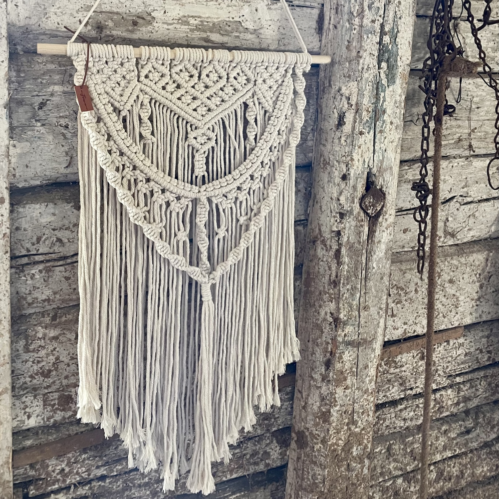 Den naturliga färgen gör makramén enkel att kombinera med olika inredningsstilar – perfekt för vardagsrum, sovrum eller hall.